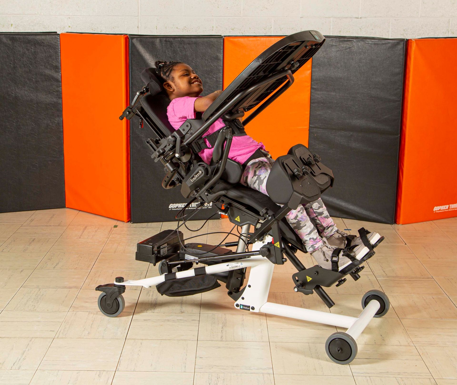 The EasyStand Bantam Medium combines features from both the Bantam and Evolv series to make it more appropriate for the larger, involved child. As children grow, transfers become more difficult, and as a result, compliance with a standing program often suffers. The Bantam Medium allows transfers to a seated or supine position, or any position in between.
