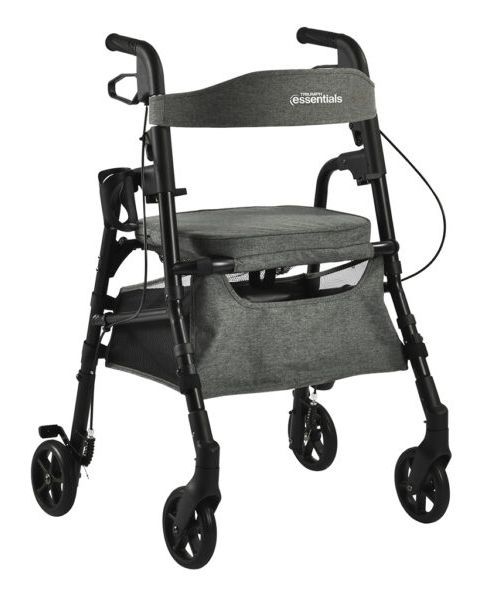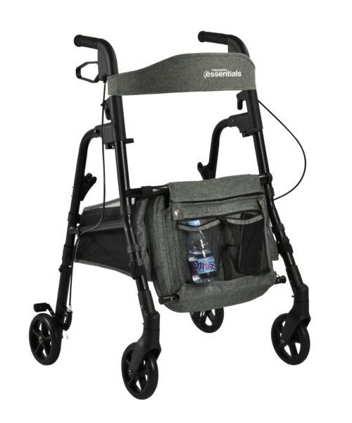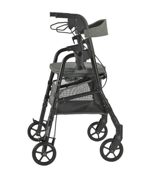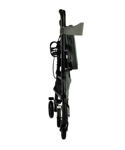 Portable folding travel rollator with front 6” swivel wheels, provides light-weight, simplicity and functionality. Padded seat, backrest, cane holder and cup holder are included.