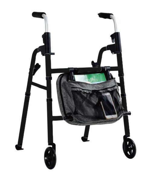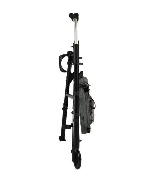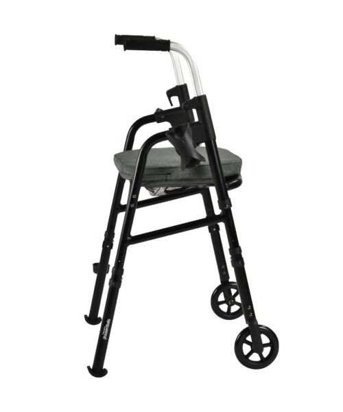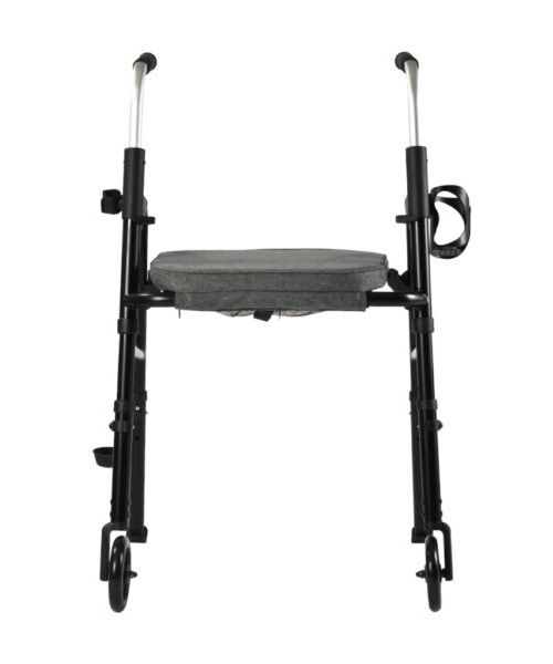 Portable folding travel walker with 5” wheels, provides light-weight, simplicity and functionality. Padded seat, backrest, cane holder and cup holder are included.