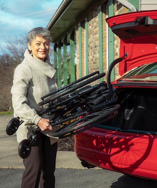At 13 lbs. this is the world's lightest wheelchair! This foldable chair is super easy to lift into a car and self propel. Its pop-off wheels allow you to store your chair in super tight spaces when traveling. Available in super stylish matte black. Now you and your chair can go anywhere.