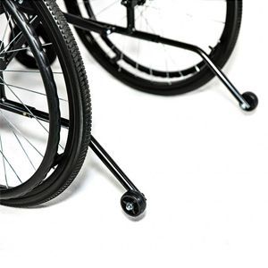 Standard features include wheel locks - easily accessible by the seated user - at the front of the frame. Wheel locks prevent the wheelchair from rolling forward or backward. For the caregiver, there is an integrated braking system, operated by bicycle style locking brake levers located at the push handles. These handbrakes provide the caregiver control, security, and convenience when descending or pausing on a slope.