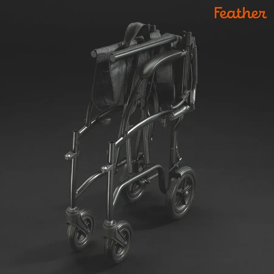 Transporting the Feather Transport Chair is effortless. It folds down into a compact package. Anyone can lift this wheelchair into a car, truck or SUV. And is super easy to maneuver.