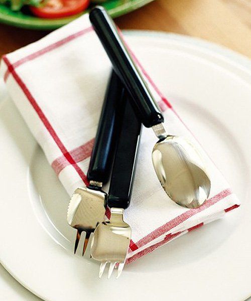 Etac Light combination cutlery consists of a fork and spoon that are equipped with a knife function on one side. This allows for cutting the food with one hand only. One side of the handle is flat to secure a stable grip when cutting. The fork/knife is available in right-handed and left-handed versions, while the spoon/knife is suitable for both.