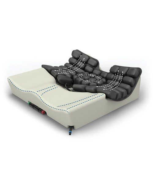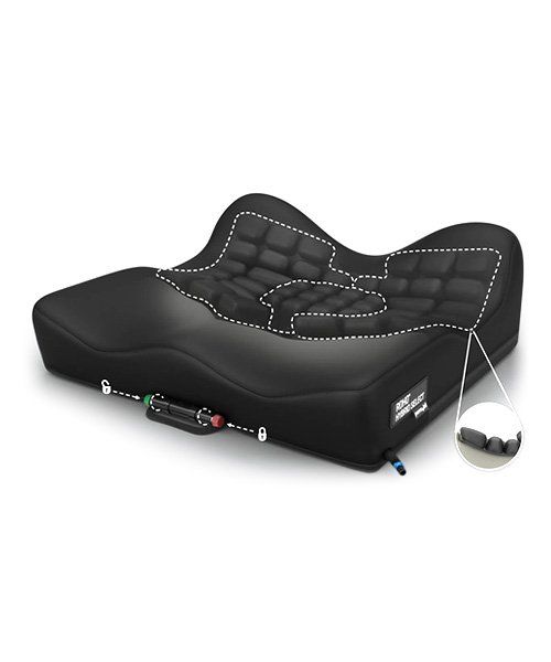 The ROHO® Hybrid Select Cushion is an ergonomically contoured design made of a combination of foam and air. This hybrid cushion has positioning capabilities utilizing the ISOFLO® Memory Control for two ROHO® sections: the dual zone overlay and the removable IT air insert that allows for offloading capabilities. The Hybrid Select also has a uniquely shaped contoured foam base made of high resiliency (HR) foam with deep leg troughs and a cut out to provide relief to the coccyx/tailbone.