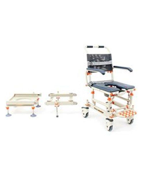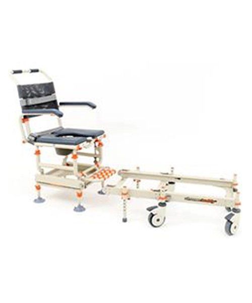 The ShowerBuddy SB1 alleviates heavy lifting and multiple transfers for toileting and showering. This chair is separated into three sections; rolling base (shower chair) bridge and shower base. The rolling base rolls around the house like a wheelchair allowing patient to easily transfer and then roll right over a toilet (certain toilets). Once completed with toileting the rolling base can connect to the bridge and then onto the shower base allowing the chair to slide into the shower. Once inside the shower the bridge disconnects and the shower base turns allowing the user to face the shower controls.